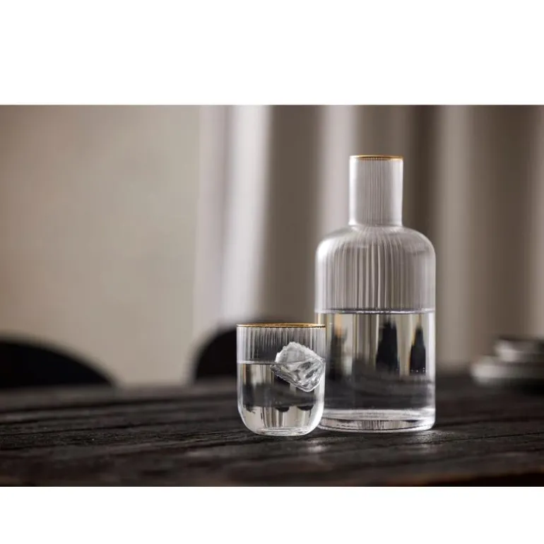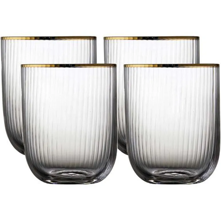 Elegant tumbler med myke og avrundede former. Den elegante, mønstrede designen med en fin gullkant gir glasset en fin vintagelook som samtidig gjenspeiler tidens trender. Server vann, juice eller drinker i glasset, og la de fine fasettene reflektere lyset og glassets innhold på en vakker måte. 35 cl Sett med 4 stk.