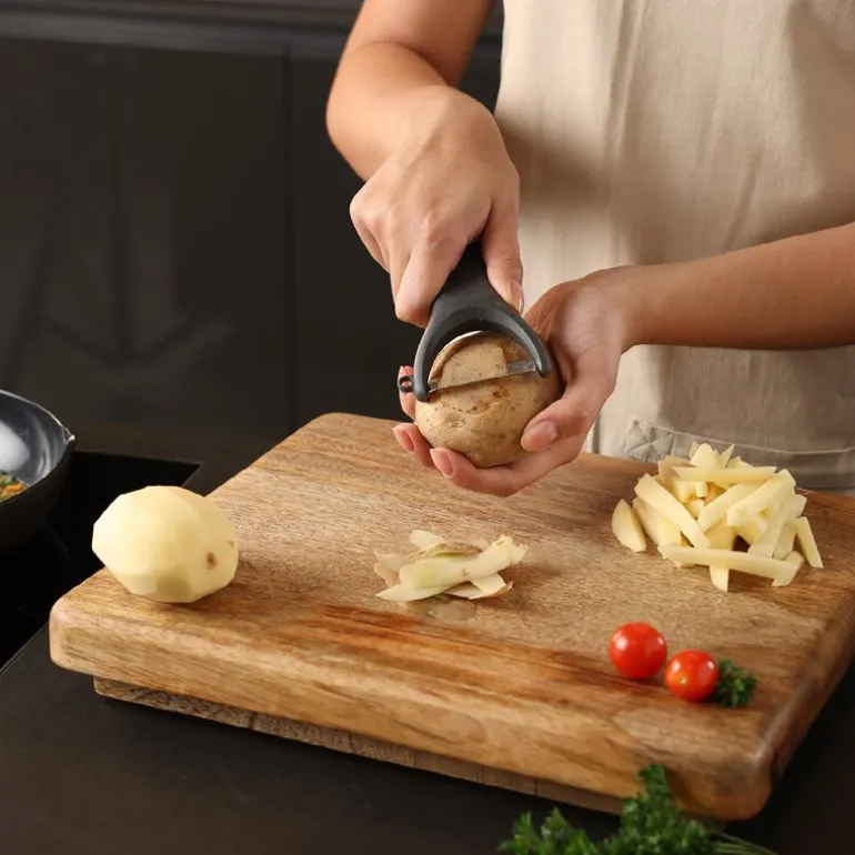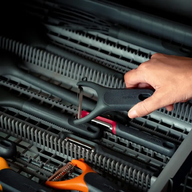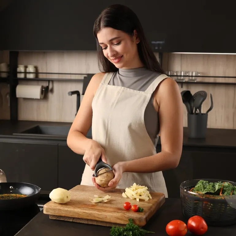 Håndtaket er ergonomisk utformet og gir et godt grep selv ved lengre bruk. Skrelleren har også en praktisk opphengsløkke for enkel oppbevaring. Et pålitelig redskap for enhver hverdagkokk.