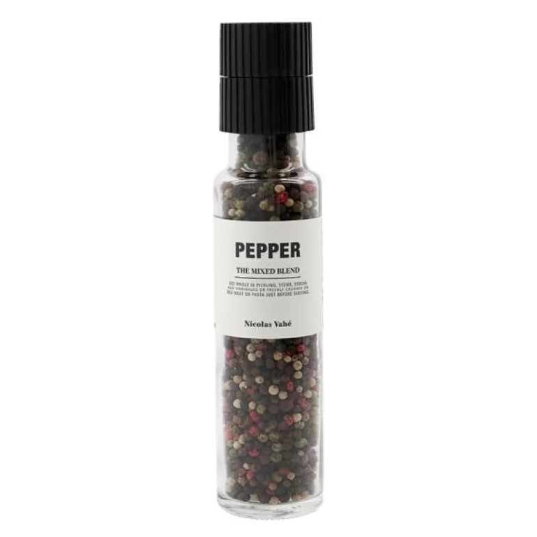 Nicolas Vahé sin pepperblanding The Mixed Blend på 140g inneholder en klassisk miks av fem forskjellige typer pepper: hvit, rød, grønn, rosa og svart. Denne unike kombinasjonen gir en balansert og aromatisk smak som passer perfekt til en rekke retter. Leveres med en keramisk kvern som sikrer ekstra finmalt pepper, slik at du får maksimalt ut av krydderet når du kverner det direkte på maten. En allsidig pepperblanding som løfter smakene i alt fra salater til varme retter.