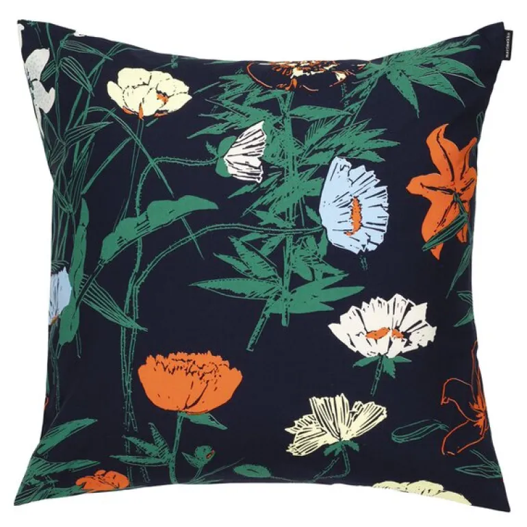Perenna-putetrekket fra Marimekko bringer en fargerik og kunstnerisk touch til hjemmet. Det måler 50×50 cm og er laget av høykvalitets bomull med et intrikat mønster trykket i Helsinki. Den mørkeblå, grønne, sitrongule og oransje fargepaletten skaper et levende uttrykk, og en glidelås på den ene siden gjør det enkelt å bytte puteinnlegg.