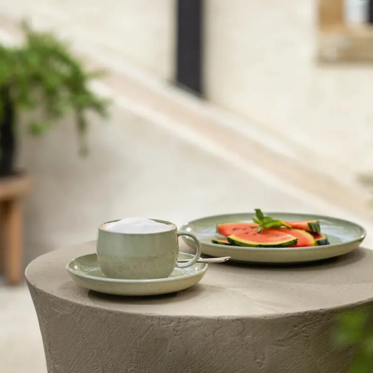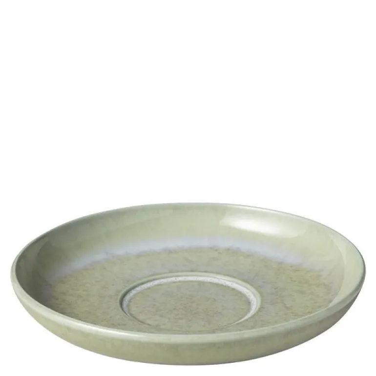 Perlemor Alga skål til kaffekopp fra Villeroy & Boch måler 16 cm og er laget i skimrende porselen med sesongens nye grønntone. Det elegante uttrykket er inspirert av havets naturlige former og nyanser.