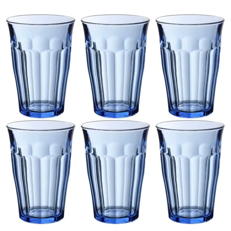 Duralex Picardie vannglass i blå kombinerer tidløs design med moderne farge og høy funksjonalitet. Glassene rommer 36 cl og leveres i sett à seks. Laget av støtsikkert og herdet glass som tåler både slag og temperatursvingninger.