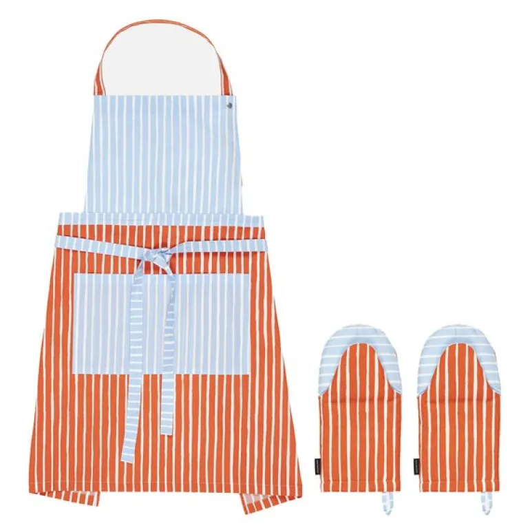 Marimekkos Piccolo forkle- og grytevottsett er et perfekt tilskudd til ethvert kjøkken. Settet består av et forkle og to grytekluter, alle laget av økologisk bomull og dekorert med det ikoniske Piccolo-mønsteret i to ulike farger. Mønsteret ble skapt av Vuokko Eskolin-Nurmesniemi i 1953 og har siden blitt et av Marimekkos mest gjenkjennelige design.