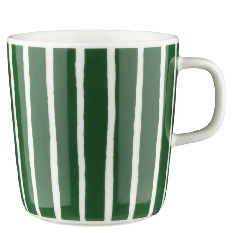 Piccolo krus med kapasitet på 40 cl fra Marimekko i hvit og grønn er en moderne klassiker med røtter i Marimekkos rike designhistorie. Kruset med Piccolo-mønster er en del av Oiva-kolleksjonen og laget av slitesterkt hvitt steintøy som tåler oppvaskmaskin, stekeovn, mikrobølgeovn og fryser. Det praktiske kruset er designet for å tåle daglig bruk, men husk å fjerne klistremerket på bunnen før bruk, da det inneholder metall.