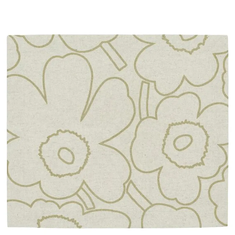 Pieni Piirto Unikko bordduk fra Marimekko er en utsøkt bordmatte i beige og gull, laget av en raffinert blanding av bomull og lin. Med målene 35 x 20 cm, er denne bordmatten ideell for å tilføre et snev av eleganse til ethvert bord. Det gyldne Piirto Unikko-mønsteret, trykt med metalliske pigmenter i Helsingfors, gir duken en luksuriøs glød, mens de ferdigbehandlede kantene og de skjulte sømmene på baksiden sikrer en høy kvalitet i utførelsen.