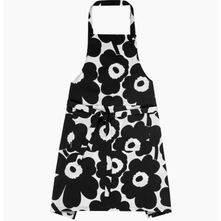 Dette bomullsforkleet har det klassiske Pieni Unikko-mønsteret i sort/hvit. En frontlomme, justerbar nakkestropp og bånd i midjen som kan knytes sammen bak. Marimekkos berømte valmuemønster Unikko ble født i 1964 i en tid da designhusets kolleksjoner stort sett inneholdt abstrakte trykk. Designer Maija Isola ønsket å skape noe interessant fra dette organiske temaet og designet en hel rekke blomstertrykk. I dag representerer den ikoniske blomsten kreativitet.