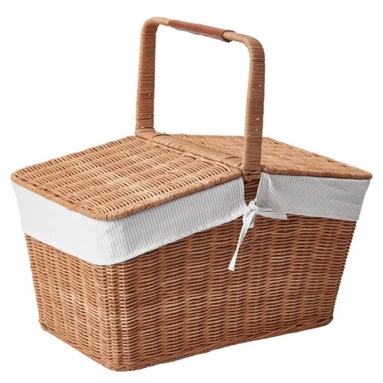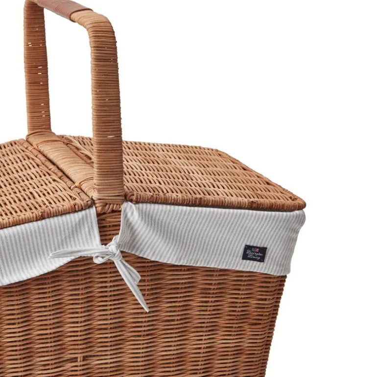 Kurvens doble lokk gir enkel tilgang, og det avtakbare bomullsfôret med beige og hvite oxford-striper tilfører en tidløs Lexington-signatur. Fôret kan enkelt tas ut og vaskes, noe som gjør kurven praktisk i bruk. Med sitt solide håndtak er den lett å bære – klar for en hyggelig piknik i naturen!