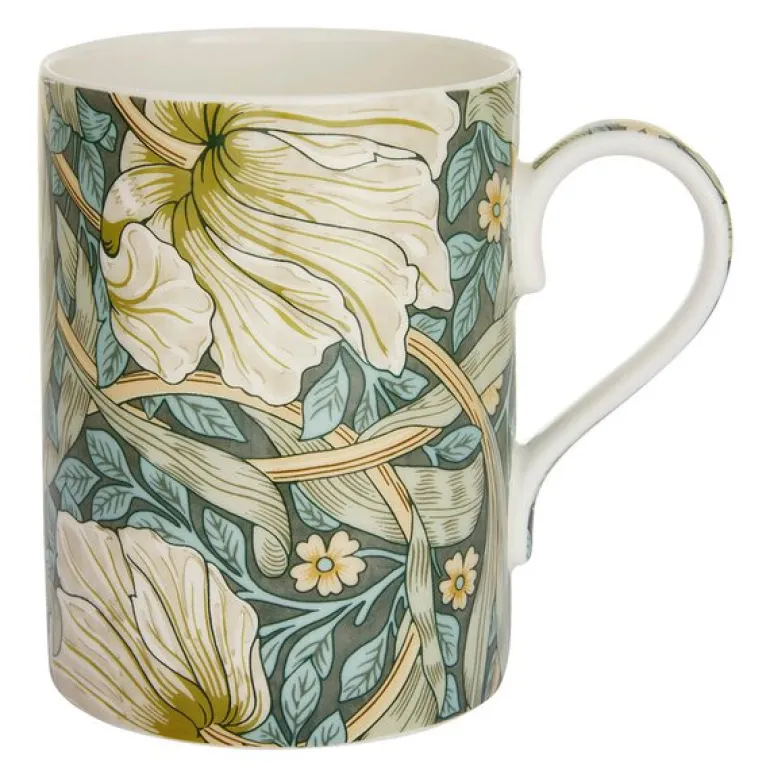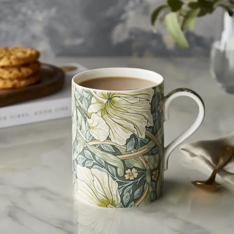 Ta med deg en bit av britisk eleganse hjem med Spode Pimpernel-koppen på 34 cl. Det klassiske Morris & Co-mønsteret med tulipanblader i grønt og krem gir en sofistikert touch til hver kaffepause.