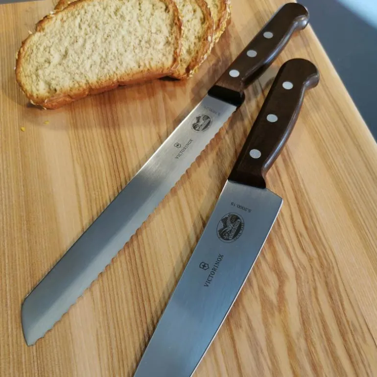 Victorinox Pine Knivsett i to deler er den perfekte følgesvennen for ethvert kjøkken. Dette settet består av to kniver: en brødkniv på 21 cm med bølget egg, og en kokkekniv på 19 cm med glatt egg. Begge knivene har robuste trehåndtak som gir en komfortabel og sikker grep.