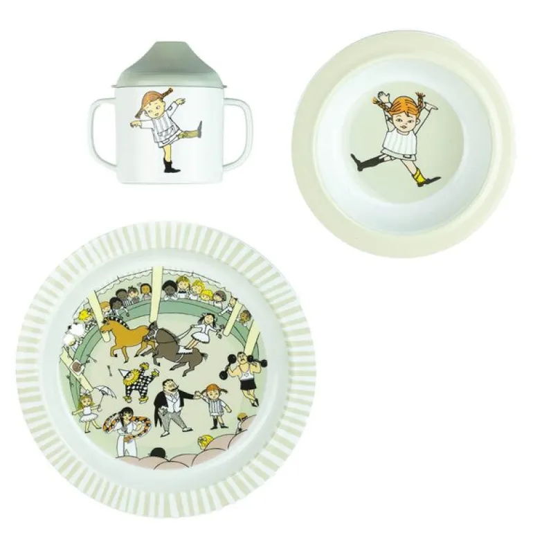 Dette lekne Pippi barneserviset fra Rätt Start, med et fargerikt sirkusmotiv, gjør måltidene morsommere for små barn. Settet inneholder tre deler: en sippykopp med to håndtak som gir barnet et stabilt grep, samt et lokk som sitter trygt fast takket være en silikonring. Tuten har en sølstopp som begrenser væskemengden, men ventilen kan fjernes når barnet blir større.
