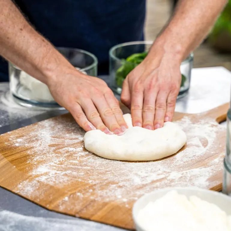 Pizzaspade i bambus. Den beste spaden til å skli pizza inn i ovnen. Deigen kleber mindre til tre enn metall og det er enklere å få den av spaden. Kan også brukes som et flott serveringsfat. 35 cm bredde.