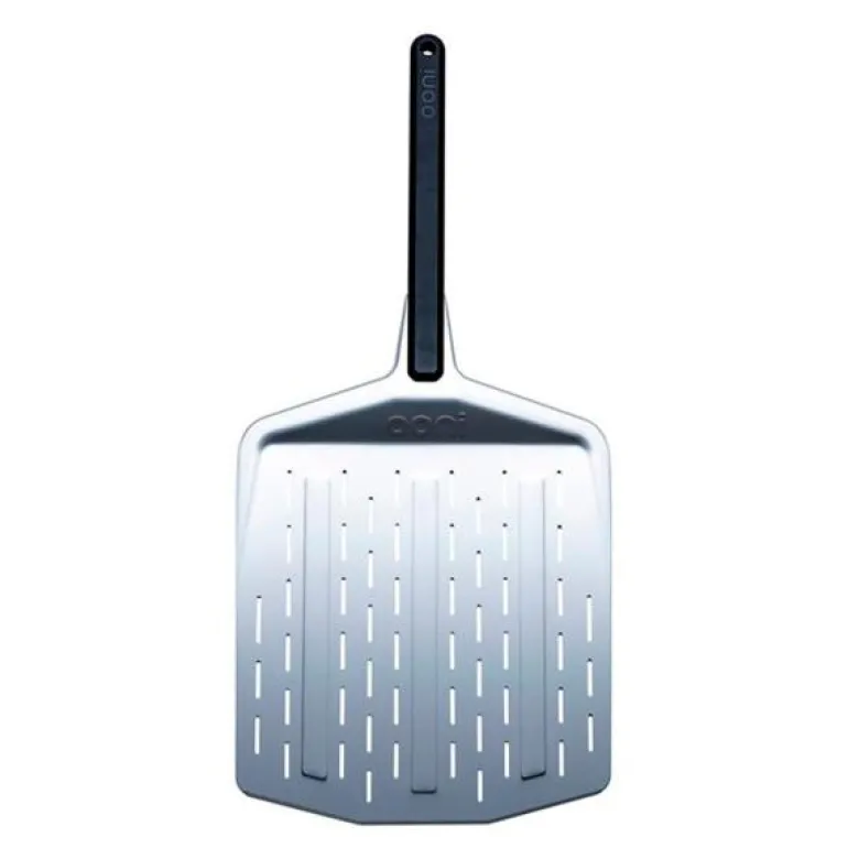 Pizzaspade med perforert blad med opphøyninger. Pizzen sklir lettere av spaden og overskytende mel drysser ut gjennom perforeringen. 30 cm bredde.