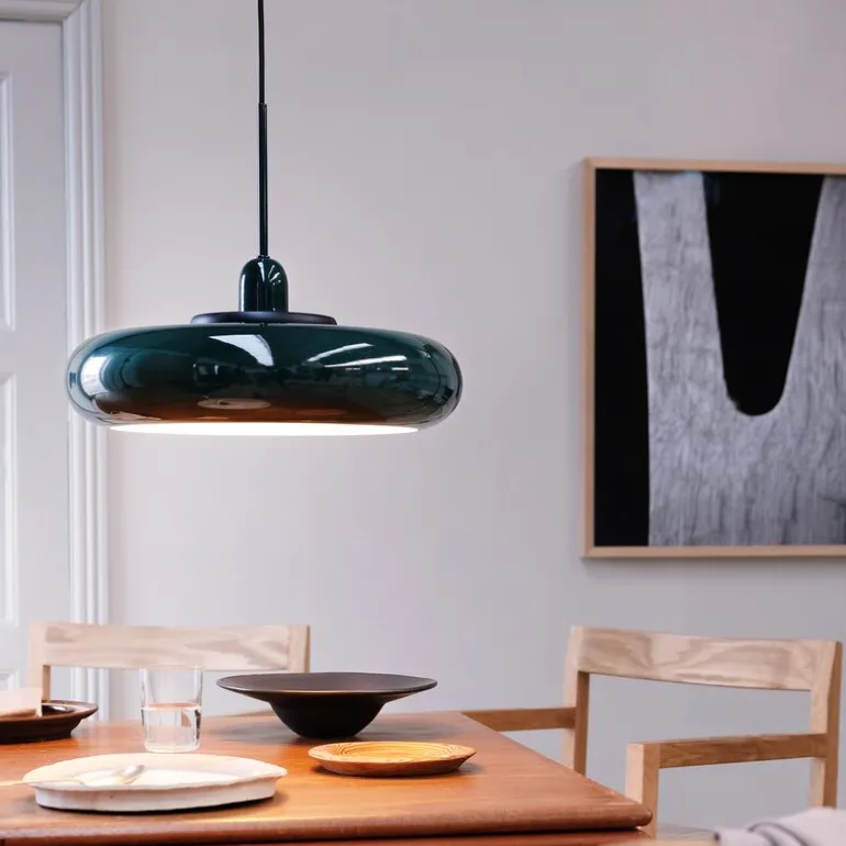 Denne pendelen er ideell over kjøkkenøya, der den gir et mykt og behagelig lys mens du lager mat, eller over spisebordet, hvor den skaper en koselig atmosfære under middager og samvær. Det varme lyset og den beroligende grønne tonen skaper en rolig og innbydende stemning i rommet, uansett hvor du velger å plassere den.