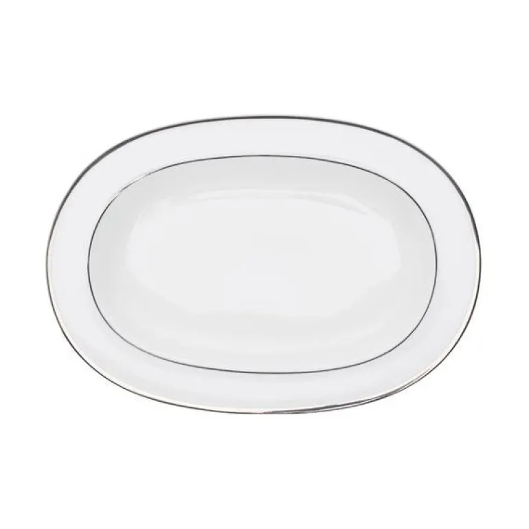 Fat til sausenebb i serviset Platinum fra Royal Porcelain. Festserviset Platinum er en tidløs serie. Serien har et rent og elegant design i hvitt benporselen kantet med sølv. Med Platinum føler du virkelig at du spiser av kongelig porselen. Gjør stas på gjestene dine ved å servere rykende varm kaffe fra den nydelige 1,2 liters porselenskannen. Platinum-serien kan fint kombineres med produkter fra Royal Porcelains andre serier, som Angelina Platinum eller Extreme Platinum.Serien er produsert av Royal Porcelain, en av Norges største merkevarer innen serviser. Platinum er laget av benporselen, som er den aller fineste type porselen. Serviset tåler oppvaskmaskin, men som med alle serviser med sølv eller gullkant bør serviset ikke vaskes med temperatur over 50 grader og det bør brukes halv dose med vaskemiddel.. Royal Porcelain Platinum får du kun hos Tilbords. Platinum-serien er et komplett festservise, som inneholder alt du trenger til de ekstra spesielle anledningene. Det enkle, tidløse designet gjør at serviset er like aktuell til alle årstider og kan kombineres med bordpynt i dine favorittfarger. Serien inneholder tallerkener i ulike størrelser – til forrett, hovedrett og dessert – serveringsfat i flere størrelser, suppeterrin, sausenebb og salatbolle. I tillegg finner du selvsagt et komplett kaffeservise. Platinum er et servise du kan samle hele livet, og er et naturlig valg å sette på bryllupslisten.