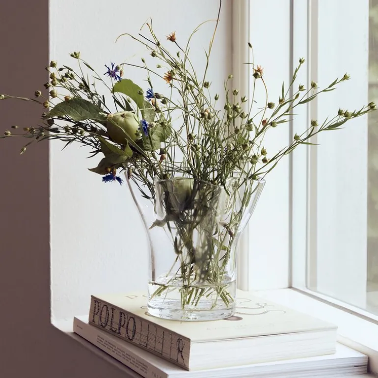 Vasens enkle og elegante form gjør den ideell til små blomsteroppsatser eller som et diskret innslag i en moderne innredning. Den gjennomsiktige overflaten reflekterer lys og gir rommet en luftig stemning.