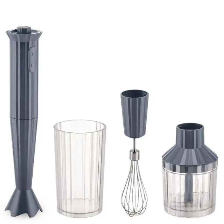 Dette settet inneholder også en stål visp og en food processor med en separat 350 ml beholder. Anti skli bunnen til begge beholderne sørger for at de holder seg godt på plass under bruk av stavmikser eller hakker.