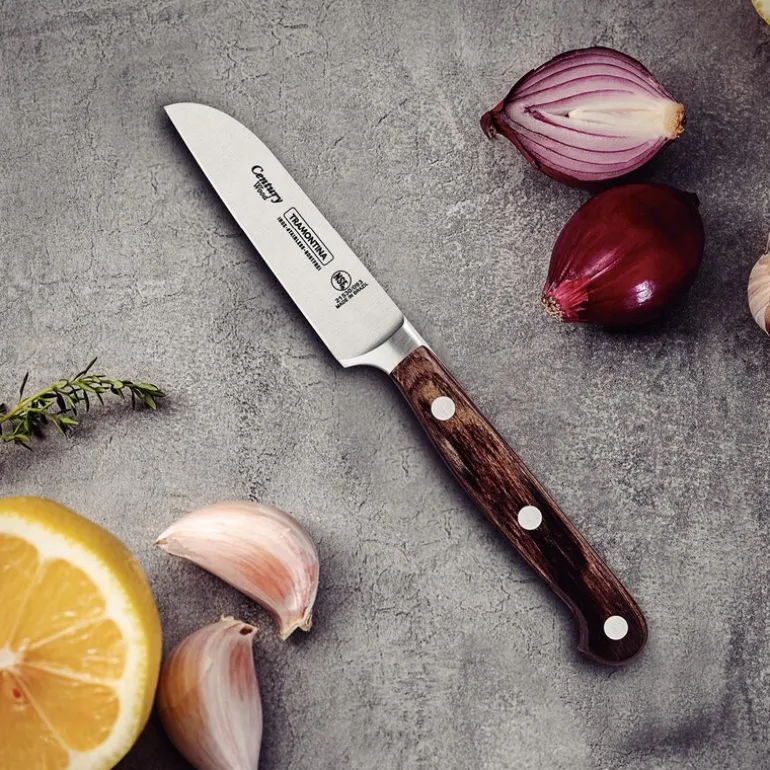 Tramontina Polywood grønnsakskniv 7,5 cm er laget for presisjon og slitestyrke i kjøkkenet. Det smidde bladet i rustfritt stål er utformet i ett monoblokkstykke og gjennomgår varme- og kuldebehandling for å sikre et holdbart og presist egg. V-formet sliping gir jevn og effektiv skjæring, også etter gjentatt bruk og sliping.