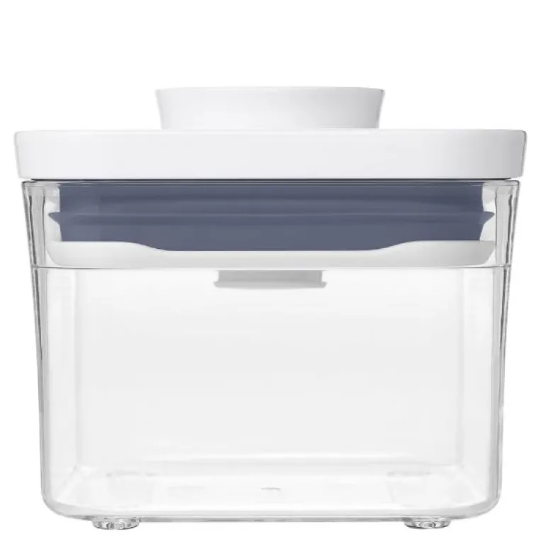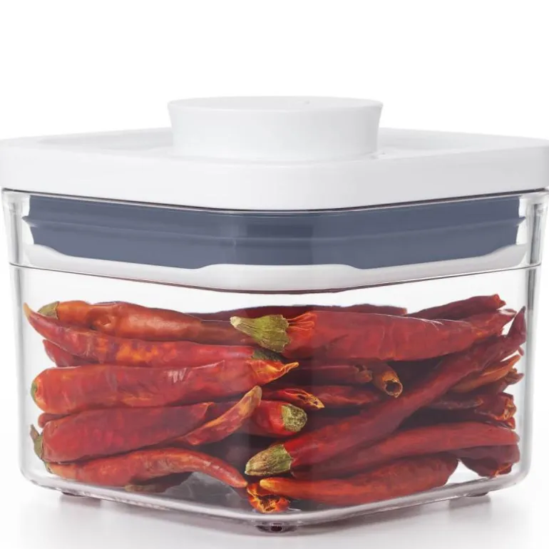 Liten kvadratisk POP Container oppbevaringsboks, perfekt til nøtter, frø, osv. POP Containers fra OXO er lufttette oppbevaringsbokser til tørre matvarer. De har et elegant design, fås i mange størrelser og kan stables, så de utnytter plassen og passer i alle kjøkkenskap. Lokket har en unik trykkfunksjon som sørger for at det lukker helt tett, samtidig som det fungerer som et håndtak, når det åpnes. Den lufttette forseglingen holder maten frisk lenger, og boksenes rundede hjørner gjør det lett å helde ingrediensene ut av dem. Lokket kan demonteres for grundig rengjøring, og både selve POP Containeren og lokket tåler oppvaskmaskin. POP Containers kan også brukes i garasjen, på hobbyrommet, barnerommet, osv.