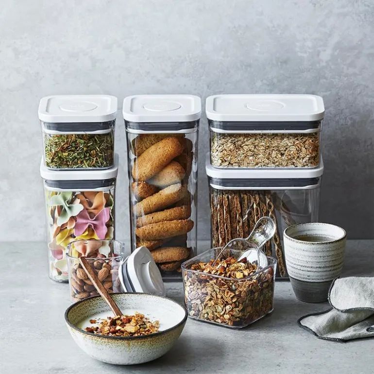 POP Containers fra OXO er lufttette oppbevaringsbokser til sukker, mel, pasta, ris og andre tørre matvarer. De har et elegant design, fås i mange størrelser og kan stables, så de utnytter plassen og passer i alle kjøkkenskapene. Lokket har en unik trykkfunksjon som sørger for at det lukker helt tett, samtidig som det fungerer som et håndtak, når det åpnes. Den lufttette forseglingen holder maten frisk lenger, og boksenes rundede hjørner gjør det lett å helde ingrediensene ut av dem. På undersiden av lokket kan man feste forskjellige tilbehør, som kjøpes separat. Lokket kan demonteres for grundig rengjøring, og både selve POP Containeren og lokket tåler oppvaskmaskin. POP Containers kan også brukes i garasjen, på hobbyrommet, barnerommet, osv.