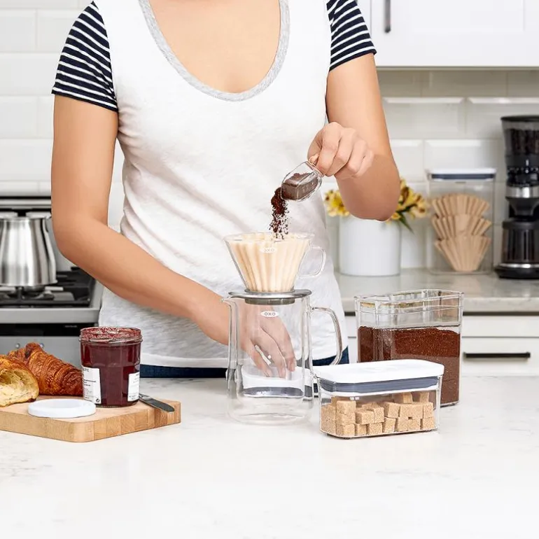 POP Containers fra OXO er lufttette oppbevaringsbokser til sukker, mel, pasta, ris og andre tørre matvarer. De har et elegant design, fås i mange størrelser og kan stables, så de utnytter plassen og passer i alle kjøkkenskapene. Lokket har en unik trykkfunksjon som sørger for at det lukker helt tett, samtidig som det fungerer som et håndtak, når det åpnes. Den lufttette forseglingen holder maten frisk lenger, og boksenes rundede hjørner gjør det lett å helde ingrediensene ut av dem. På undersidne av lokket kan man feste forskjellige tilbehør, som kjøpes separat. Lokket kan demonteres for grundig rengjøring, og både selve POP Containeren og lokket tåler oppvaskmaskin. POP Containers kan også brukes i garasjen, på hobbyrommet, barnerommet, osv.