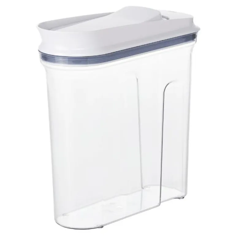 Praktisk og flott oppbevaringsdispenser som passer godt til frokostblandinger og andre tørre matvarer. Lokket åpnes og lukkes med et enkelt trykk, og det er enkelt å helde innholdet ut av dispenseren. Lokket har to silikonpakninger som holder beholderen tett og innholdet friskt. Dispenseren har en smal, rektangulær form, som sikrer optimal utnyttelse av plassen i kjøkkenskapet eller på kjøkkenbenken. BPA-fri. Tåler oppvaskmaskin.