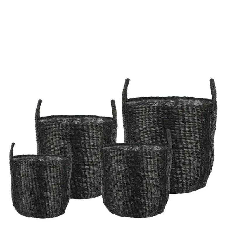 Dette settet med fire pottekurver i svart flettet sjøgress fra GUS Design kombinerer naturlig skjønnhet med praktisk funksjonalitet. Med høyder på 35, 30, 25 og 20 cm, og diametre på 40, 35, 30 og 25 cm, tilbyr kurvene både variasjon og fleksibilitet. De fine flettene gir en jevn overflate som fremhever det elegante designet, mens de praktiske håndtakene gjør dem enkle å flytte. Innsiden er foret med plast, noe som gjør kurvene ideelle som potter til planter. Samtidig er de perfekte til oppbevaring av småting, og bidrar til å holde hjemmet ryddig og organisert. Den naturlige teksturen kombinert med den stilige svarte fargen gjør dem til et dekorativt element som passer inn i ethvert rom, enten det er stuen, kjøkkenet eller gangen.