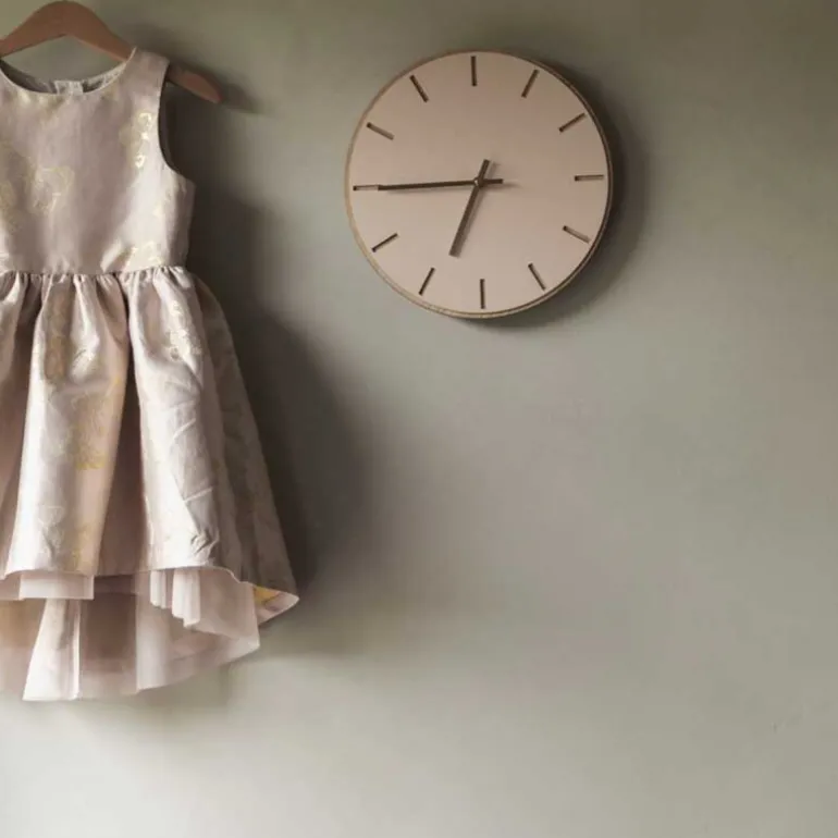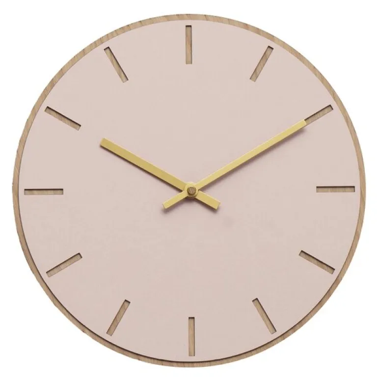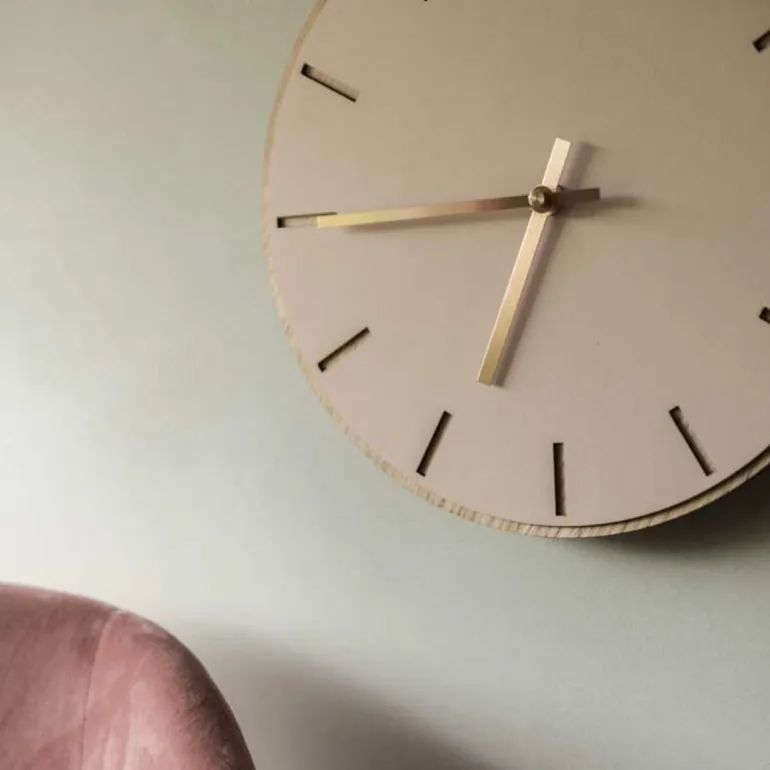 Hemverks Powder veggklokke kombinerer støvete rosa linoleum med en lys base av eikefiner, som sammen gir et lyst, skandinavisk uttrykk. Klokken, som måler 28 cm, har delikate utskårne timeindikatorer og gullvisere som tilfører en luksuriøs, men subtil glans til det minimalistiske designet. Den myke rosa fargen mot de elegante gullviserne gjør denne klokken til en sofistikert detalj i rommet. Velg visere som enten matcher eller kontrasterer, for å skape et helt personlig og unikt uttrykk som passer inn i ditt interiør.