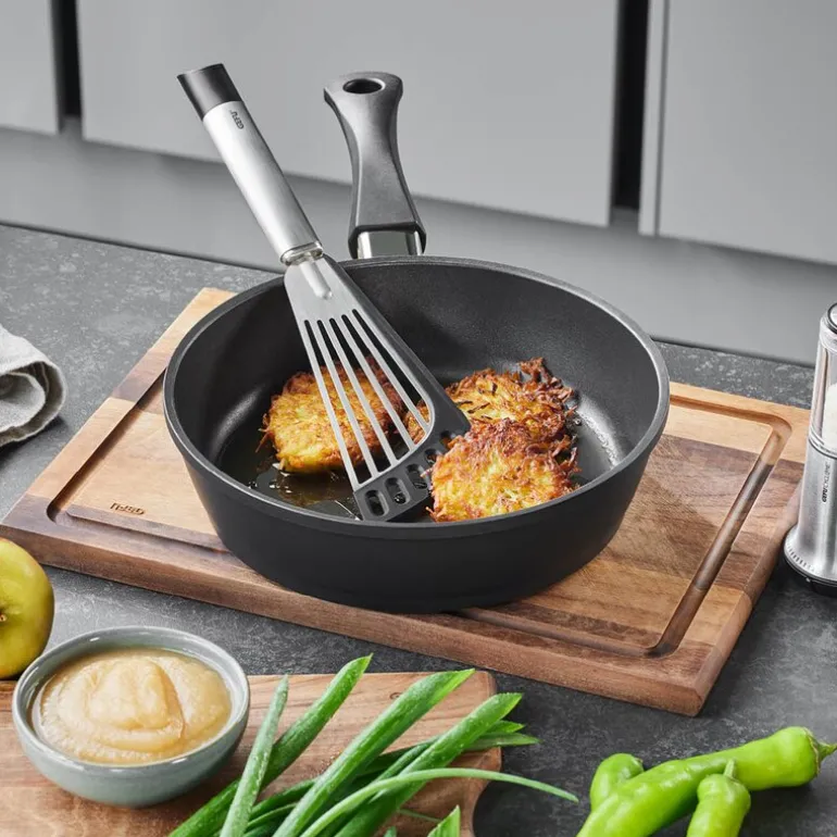 Stekespaden er varmebestandig opp til 250°C, noe som gjør den trygg å bruke ved høye temperaturer. Det ergonomisk formede håndtaket er designet for å være behagelig balansert, med en integrert hengekrok for enkel oppbevaring. Den fleksible silikonleppen sørger for at ingenting fester seg, noe som gir en sømløs matlagingsopplevelse.