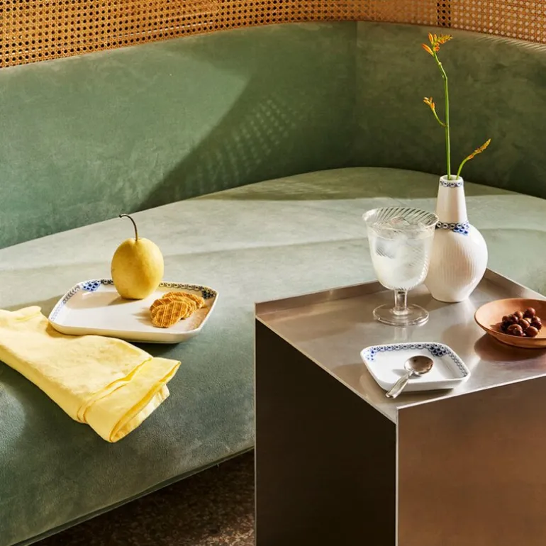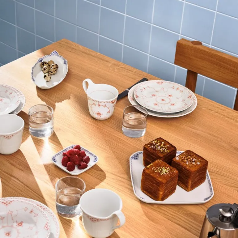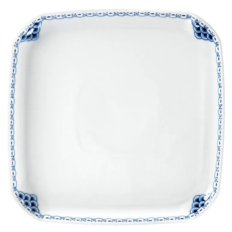 Prinsesse firkantet tallerken 21 cm fra Royal Copenhagen. Med vakre håndmalte dekorasjoner på blondekanten og en ellers blank riflet overflate, fungerer Prinsesse firkantede fat som en vakker borddekking for servering av velsmakende snacks eller nybakte småkaker.