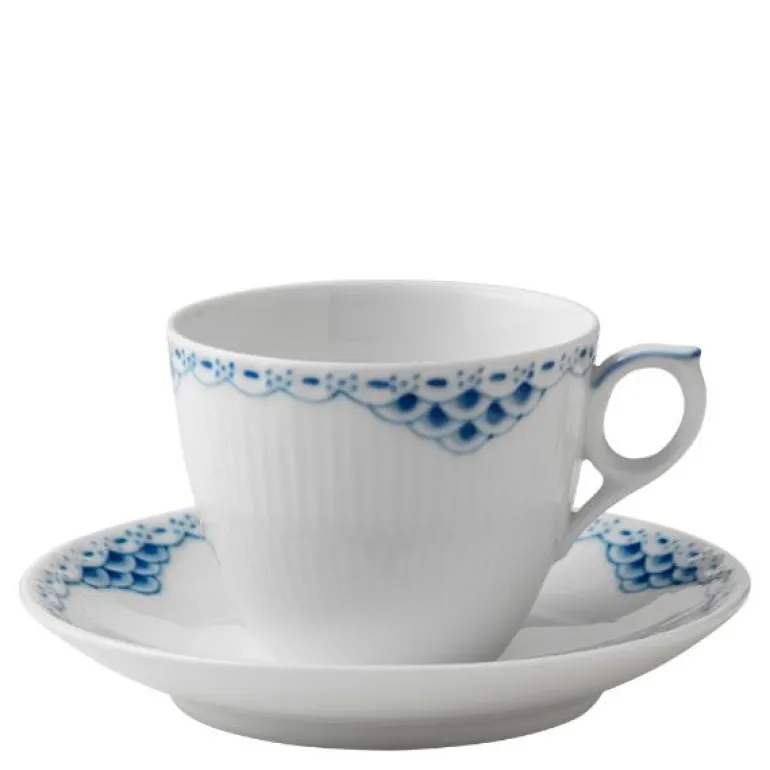 Prinsesse kopp og skål 17 cl. Prinsesse-serien er romantisk med et lett uttrykk. Opprinnelig ble det designet som et teservise, men i 1978 ble mønsteret produsert som et fullt middagsservise. Den håndmalte, elegante blondekanten kan minne om mønsteret i Musselmalt-serviset.