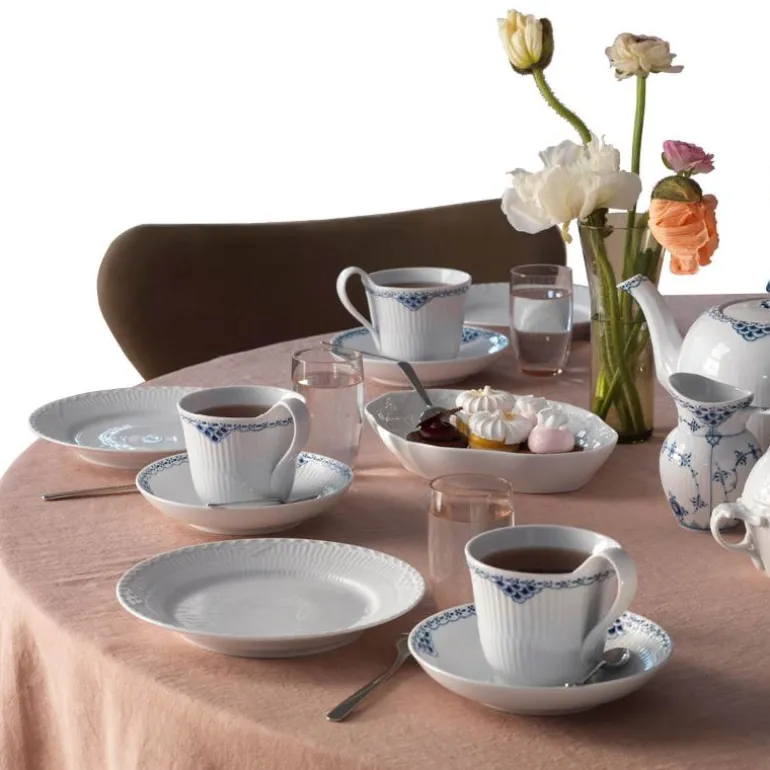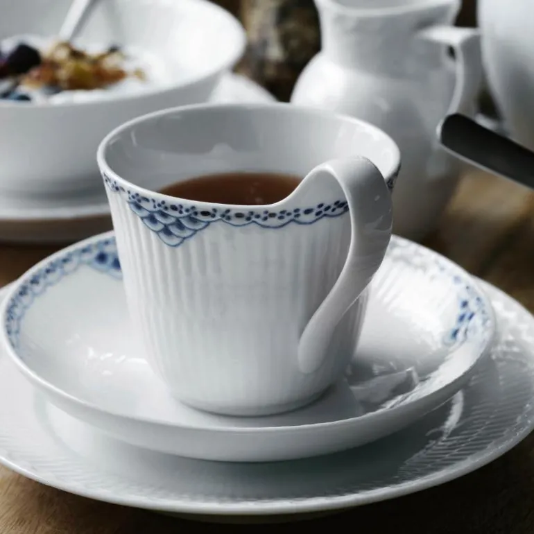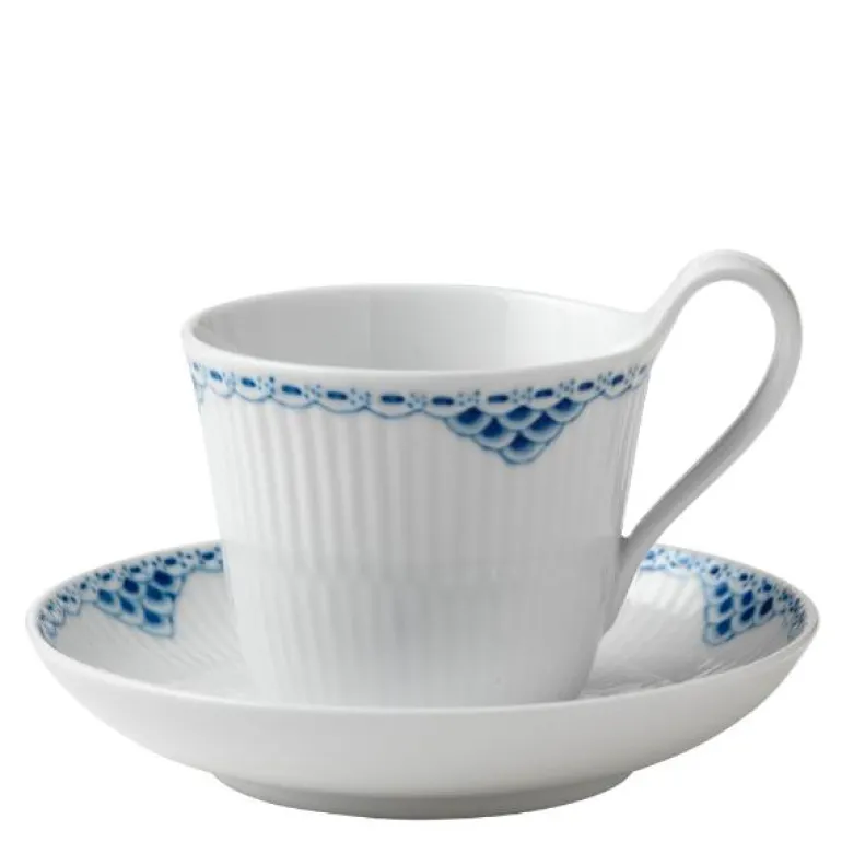 Prinsesse høyhankskopp og skål 24 cl. Prinsesse-serien er romantisk med et lett uttrykk. Opprinnelig ble det designet som et teservise, men i 1978 ble mønsteret produsert som et fullt middagsservise. Den håndmalte, elegante blondekanten kan minne om mønsteret i Musselmalt-serviset.