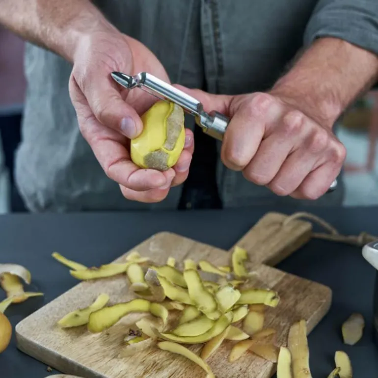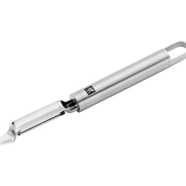 Grønnsaksskreller med bevegelig blad fra Pro-serien til Zwilling. Frukt og grønnsaker må ofte skrelles før videre tilberedning, en oppgave som er spesielt enkel med riktig kjøkkendings. Zwilling Pro skreller 21 cm med bevegelig blad er perfekt for rund-peeling og dens ergonomiske design gjør oppgaven mye enklere. Det bevegelige tvillingbladet er skarpt på begge sider for å skrelle i begge retninger. Utformingen av grønnsaksskrelleren er perfekt tilpasset oppgaven; knivsporene er plassert for å hindre at skallet fester seg, og bladet på spissen av den bevegelige skrelleren fjerner enkelt øyne og blåmerker i maten du skreller.