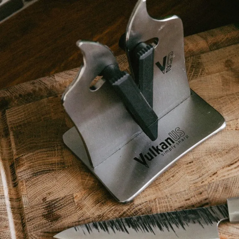 Denne klassiske knivsliperen fra Vulkanus generasjon 2.0 er designet for å gi myke og skarpe bladegger på knivene dine, slik at eggen blir sylskarp. Dette er det perfekte hjelperedskapet til enhver kniventusiast som vil ha skarpe kjøkkenredskaper. Den kan også plasseres i oppvaskmaskinen og gir superskarpe resultater. Pakket i eske. HVA ER NYTT HOS GENERASJON 2:- Justert vinkel på sliping til 11 – 21 grader- Økt bredde på åpningen- På grunn av de nye forbedringene unngår man muligheten for å skjære i plasten under sliperneRockwell (hardhet) på stålplatene: 93 HRCHvordan arbeide med en VulkanusDe fleste av oss har jo vært borti sløve kniver, og vet hvor mye enklere det er å gjøre kjøkkenjobben med en ny og skarp kniv. Med Vulkanussliperen kan du ta vare på følelsen av en helt ny kniv i mange år. Med en vanlig «knivsliper» (som gjerne er skjerpestålet med treskaft som de fleste har vært borti, men også keramiske skjerpestaver eller diamantskjerpere) vil man bare kunne opprettholde en allerede skarp knivsegg, og dette krever at man bruker skjerpestålet jevnlig og riktig helt fra kniven er ny. Men med Vulkanussliperen kan man faktisk både skjerpe og slipe.Formen er nøkkelen til Vulkanussliperens unike egenskaper: den er nemlig laget slik at man kan skjerpe og slipe alle kniver med ett og samme verktøy. De to sorte «slipebeina» er bevegelige og vil selv tilpasse riktig vinkel til kniven. Ved å holde kniven på forskjellige måter, kan man både holde eggen på de nye knivene dine fine og skarpe, og også gi de gamle og sløve knivene et nytt liv! Vulkanussliperen kan brukes på nær sagt alle kniver, også brødkniver og andre kniver med tagger i eggen. Det er allikevel viktig å sjekke at eggen er hel og uten hakk – dersom eggen har hakk, bør den settes opp på nytt av en profesjonell knivsliper.Man starter alltid med å ha knivsliperen på et stødig underlag, og holder den med én hånd med siden med de to «beina» mot seg. Dersom kniven er sløv og skal slipes, holder man den med spissen ned og drar kniven mot seg (pass på fingrene!). Dette vil gi en virkelig god slipeeffekt på eggen, og det kan bli liggende igjen spon på bunnplaten av sliperen. Om kniven bare er litt sløv eller eggen skal holdes skarp, holder man kniven med spissen opp og drar mot seg. Da vil det ikke bli spon.Dersom kniven har en taggete egg, for eksempel en brødkniv, holder man spissen opp eller ned ettersom hvor sløv kniven er. I tillegg holder man den siden av kniven som ikke har oppslipt egg (taggene er som regel kun på den ene siden av kniven) inntil «slipebeinet». Med dette sørger man for at kniven kun slipes på riktig side, og eggen holdes sylskarp uten å ødelegge taggene.Dette gjør at Vulkanussliperen kanskje er den aller enkleste i bruk på markedet! De bevegelige «slipebeina» sørger for at man får sylskarpe kniver uten å måtte tenke på eggen, og uten å risikere varmgang eller skade. Hold bare kniven med spissen ned (gjør eggen skarp) eller opp (hold eggen skarp) og dra til – det er umulig å skade kniven. Og når du er ferdig og har blanke og fine kniver igjen, er det bare å putte Vulkanussliperen i oppvaskmaskinen (classic eller basic modell) – blir det bedre? Kniver produseres med ulike vinkler på kniveggen, og jo mindre vinkel du har jo mindre press bør du legge på kniven ved sliping. Det er viktig å informere kunden om hvordan de bør gå frem for å ikke ødelegge en knivegg med for hard behandling ved knivsliping.Hvordan slipe kniver med Vulkanus:https://youtu.be/SiHqGOdrx1QHvordan hone (skjerpe) kniver med Vulkanus:https://youtu.be/balQALSZgi0Hvordan finpusse en kniv med Vulkanus:https://youtu.be/f7rUrJOF9O8