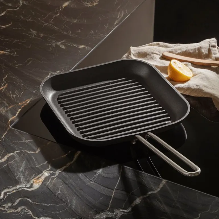 Professional grillpanne 28×28 cm fra Eva Trio. Det ultimate verktøyet for den ambisiøse kokken. Pannen etterlater grillmerker på maten og lar fett og saft renne vekk, slik at du kan nyte grillopplevelsen innendørs. Den profesjonelle grillpannens kropp er laget av 85 prosent resirkulert aluminium med en 10 mm bunn, en 7 mm kant og et 10 mm trådgrep. Den kraftige konstruksjonen sikrer maksimal holdbarhet og utmerket varmeregulering og -fordeling. Den keramiske Slip-Let®-belegningen gir pannen en utmerket non-stick-effekt som gjør matlaging og rengjøring enklere. Pannen tåler temperaturer opp til 400°C og fungerer på alle varmekilder, inkludert induksjon. Vi tilbyr 5 års beleggsgaranti og 25 års garanti på at pannen holder formen og ikke blir skjev i bunnen. Tåler oppvaskmaskin, men det anbefales å vaske pannen for hånd for å bevare non-stick-effekten.