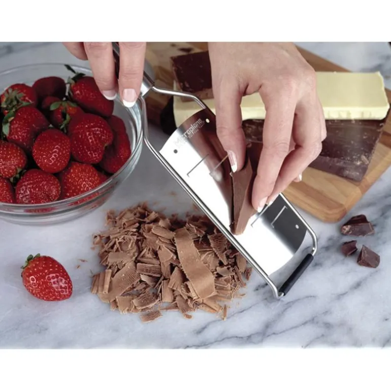 Utnytt den store høvelen til å lage lekre flager til pynten på din mat. Høvelen er en del av Microplanes Professional-serie. Den har sylskarpe skjær, som er laget av rustfritt stål. Det gjør, at den skjærer i steden for å flå råvarene, så det bevares mere smak og aroma. Tradisjonelle rivjern flår nemlig dine matvarer. Det er ingen sløve blader, hvilket sikrer en høy kvalitet og gjør, at mange profesjonelle velger disse rivjern fremfor andre. Skjæret er faktisk så skarpt, at det kan rive i tre. Dertil er det et ergonomisk grep med soft-grip, som ligger godt i hånden samt en sklisikker fot, som gjør arbeidet sikkert. Med et klassisk og enkelt design, er Professional-serien en du ønsker å ha i hjemmet. Egentlig er Microplane oppfunnet, som et snekkerverktøy, men en canadisk kone prøvde det på kjøkkenet og med stor suksess. Den store høvelen er ideell til harde oster og sjokolade.