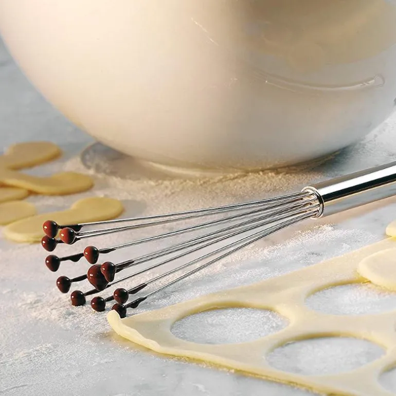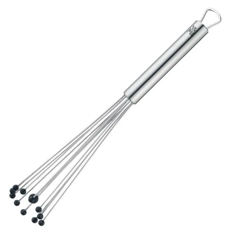 Den innovative vispen med kuler fra WMF visper saus, marinade, dressing, fløte og mye mer på få sekunder. Ved hjelp av formen – et stabilt, handy skaft, fleksible tråder og de små kulene – når du også den ytterste kanten i gryter eller skåler. Kulene utvikler sin egen dynamikk, og ingenting klistrer seg fast mellom trådene. Trådene av rustfritt Cromargan® er fleksible og beholder likevel formen sin. Visper med kuler fra WMF fås i forskjellige størrelser og er lette å rengjøre. Kort og godt: WMF-vispen med kuler er et kjøkkenredskap som virkelig begeistrer.