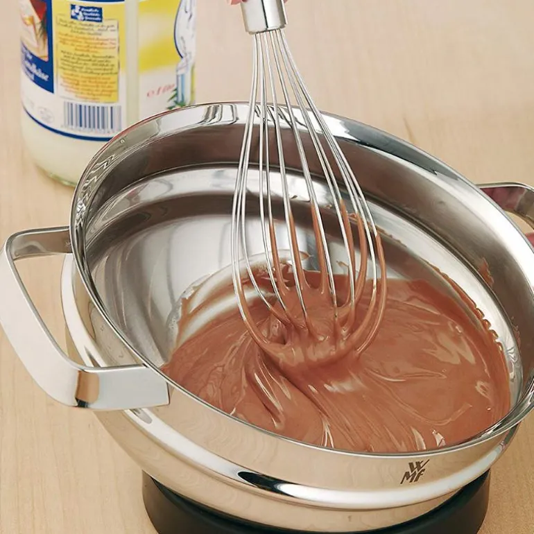 Med den fleksible vispen fra WMF Profi Plus-serien kan du vispe lette kremer og luftige sauser på et blunk. Det ovale forstykket har en tynn spiral festet på seg. Denne gjør at du når inn i alle kantene av gryten – og helt ned i bunnen slik at du unngår at det brenner seg fast. Skaftet er langt nok til at du lett kan blande selv i dype gryter. Det delvis matterte Cromargan rustfrie stålet er stabilt og holdbart. Vispen er lett å rengjøre: Bare legg den rett i oppvaskmaskinen.