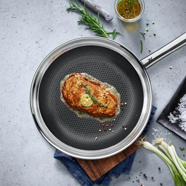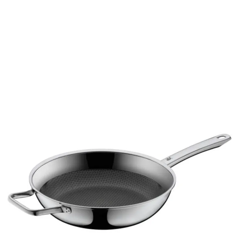 Stekepanne 28 cm, Profi Resist fra WMF, er den første pannen med slippbelegg som holder hele livet. Slippbelegget er beskyttet takket være den forhøyede strukturen av rustfritt stål. Det gør stekeflaten ripefast, slitesterk og holdbar hele livet. Profi Resist kombinerer dermed fordelene ved en panne av rustfritt stål og en panne med slippbelegg, og gir de beste betingelsene for en saftig, velstekt biff og alt annet som stekes ved høye temperaturer. WMF-serien Profi Resist forener de beste egenskapene ved en panne av rustfritt stål med en modell med slippbelegg: Aluminiumskjerne, rustfritt stål innvendig og ekstremt motstandsdyktig kromstål utvendig. Dessuten sørger belegget på stekeflaten for at maten ikke lenger blir brent fast. Skru opp varmen – rustfritt stål tåler høye temperaturer – og fjærkre og andre kjøttstykker får en lekker og sprø skorpe. Profi Resist-panner er ganske enkelt perfekte til alt det du vil brune fort. Stek i vei! Du vil få stor glede av pannen i lang tid, for den forhøyede bikube-strukturen av rustfritt stål beskytter Profi Resist-modellenes slippforsegling. WMF gir 5 års garanti på pannen Profi Resist. Pannene av flerlagsmateriale fordeler varmen jevnt og er egnet til alle komfyrtyper, også til energieffektive induksjonskokeplater.
