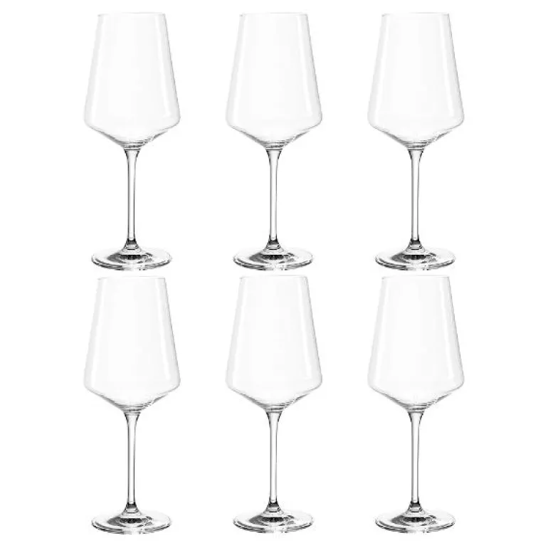 Sett med seks store hvitvinsglass fra Leonardos Puccini-serie. Med sine rette, stilige linjer passer glassene til de fleste borddekning. Glassene er laget av støtbestandig Teqton-glass og tåler oppvaskmaskin. Volum 56 cl.