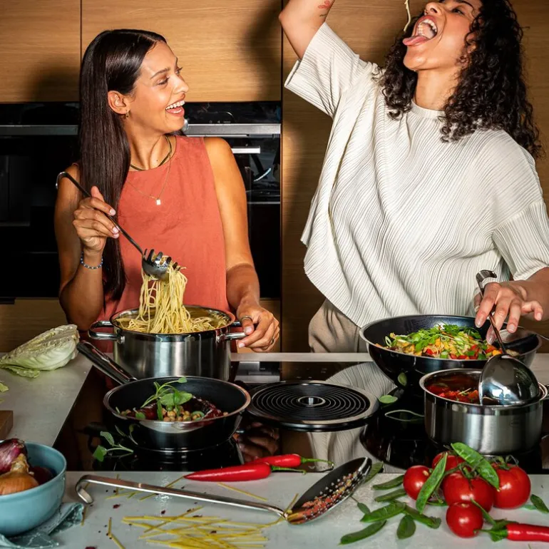 Settet passer for alle varmekilder, inkludert induksjon og ovn. Produsert av minimum 90 % resirkulert rustfritt stål og aluminium. Håndvask anbefales for å bevare beleggets kvalitet over tid.