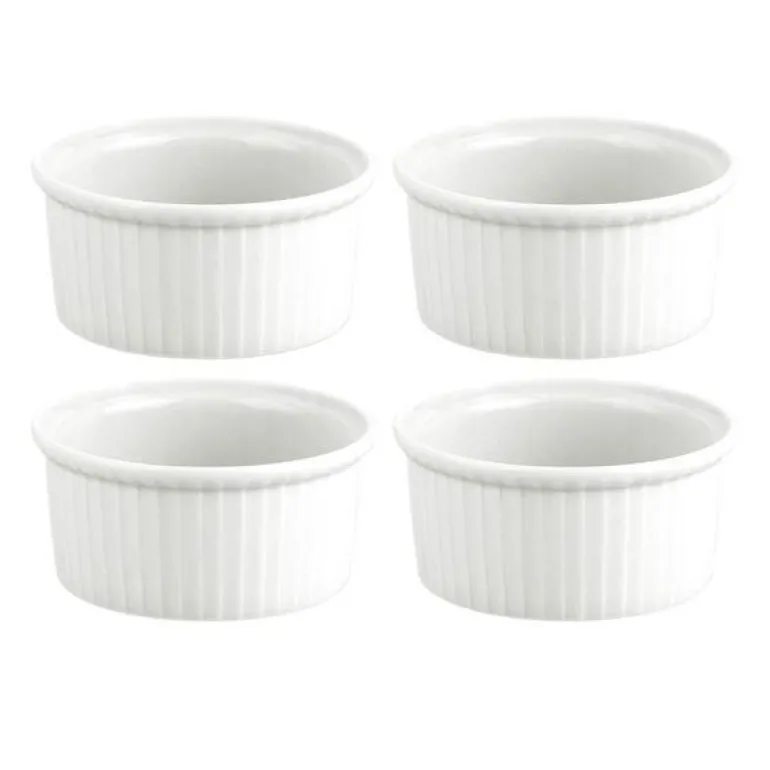 Et sett med fire ramekins fra Pillivuyt som hver holder 15 cl. Laget i hvitt slitesterkt porselen som er utmerket å servere både varme og kalde desserter i. Det hvite skinnende porselenet skaper et elegant og profesjonelt inntrykk nesten uansett hva du serverer. Porselenet er herdet ved høye temperaturer og dermed både slitesterkt og lett å vaske.