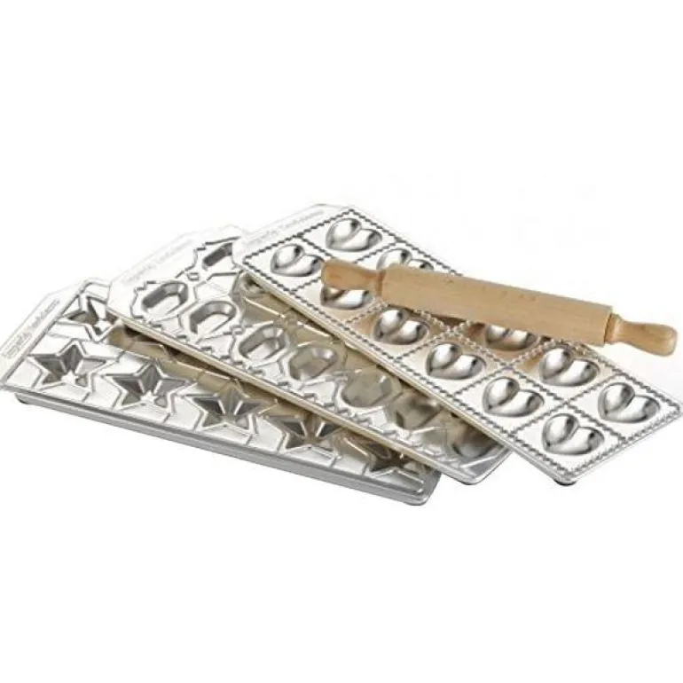 Skal du lage ravioli er dette settet en god hjelp når du skal ha i fyll. Formene er laget av presset aluminium og leveres med en hendig kjevle. La Imperia pastamaskinen gjøre jobben med deigen først. Gummiføtter under formene for godt grep. Produsert i Italia.