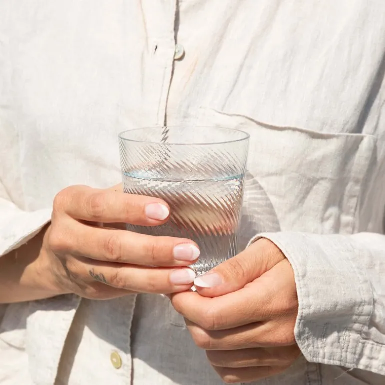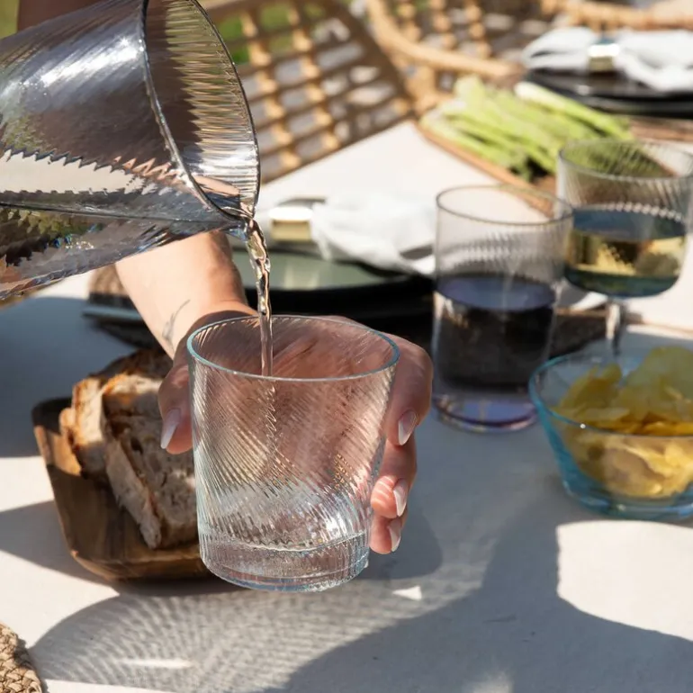 RAW Unique Swirl vannglass fra Aida er et 30 cl glass i en delikat lyseblå farge som forener tidløs eleganse med moderne design. Hvert glass er munnblåst og håndlaget med presisjon, noe som gir det en tynn og eksklusiv kvalitet. Serien er nøye utformet for å matche ditt RAW steintøy, og kommer i to unike mønstre: Swirl med sine elegante, tette linjer, og Optic med brede, flytende linjer. Disse mønstrene skaper et organisk og sofistikert uttrykk som tilfører noe ekstra til borddekkingen.