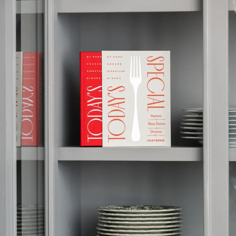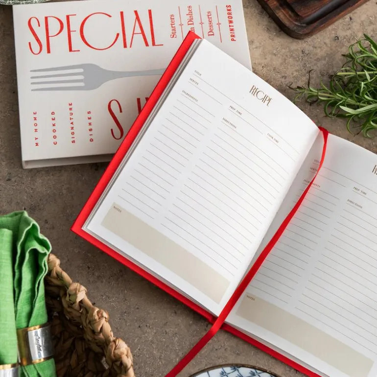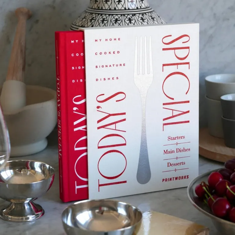 Recipe Book today’s special fra Printworks. I denne elegante oppskriftsboken kan du enkelt skrive ned oppskrifter og matlagingsingredienser til alle favorittrettene dine. Enkelt sagt er det en kokebok med kun de rettene du liker best. Boken inneholder 50 ark (100 sider) med trefritt papir med linjer for ingredienser og fremgangsmåte, og har en elfenbenshvit boks designet for å beskytte og oppbevare den livlige rødfargede boken. La dine signaturretter leve videre i generasjoner fremover.