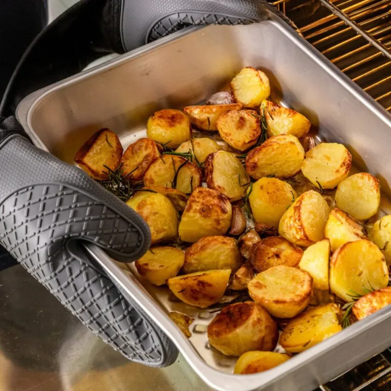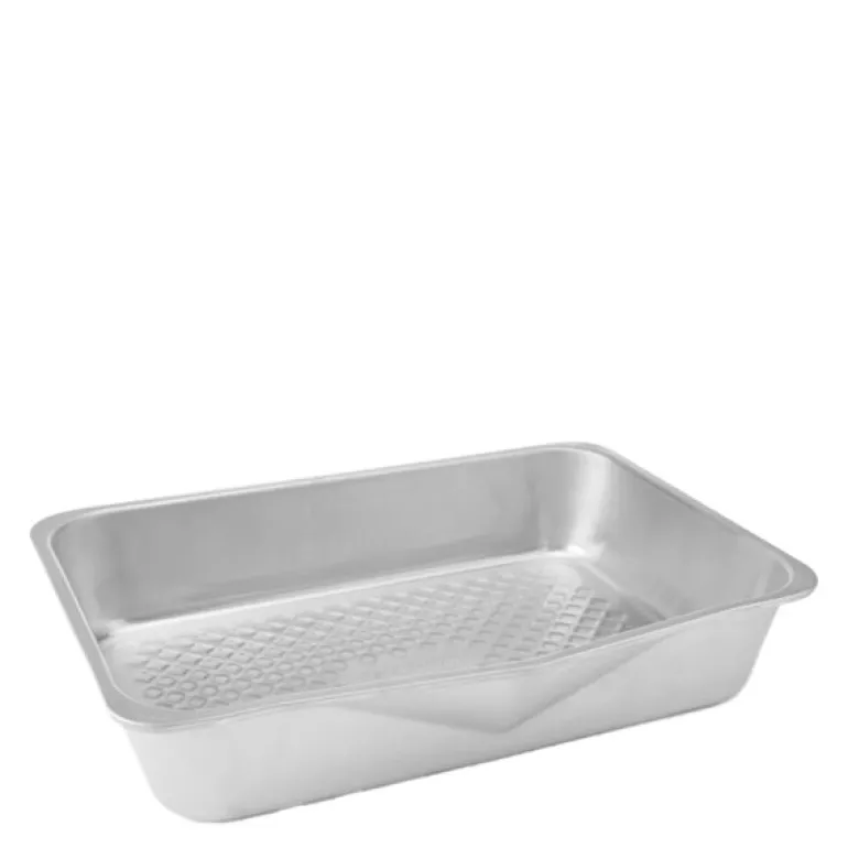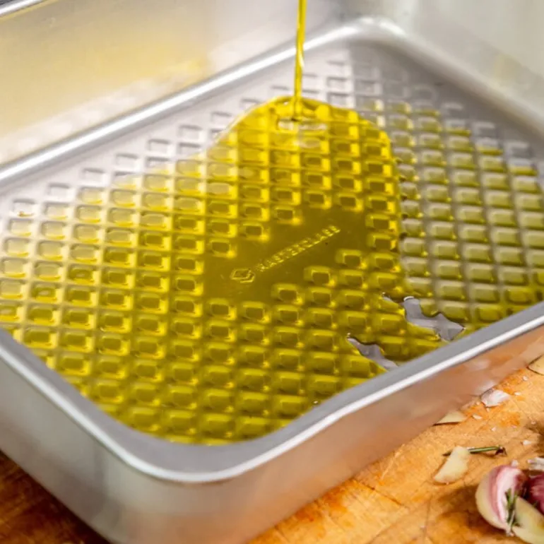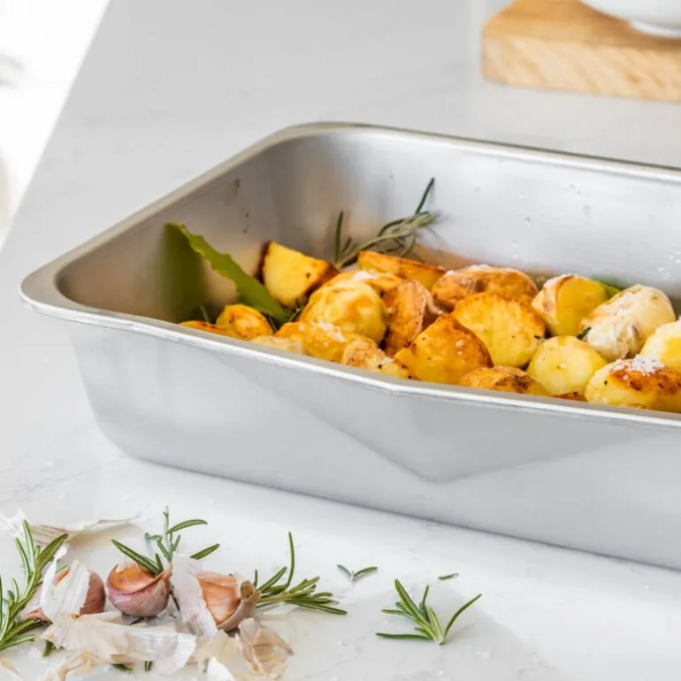 Ovnsbrett 40×28 cm fra MasterClass sin serie Recycled Aluminium. Gjør søndagsmiddagen ekstra spesiell med dette ovnsbrett, designet for å håndtere alt fra saftige steker til ovnsbakte grønnsaker med letthet. Dette romslige brettet måler 40 x 28 cm og er laget av sertifisert resirkulert aluminium, kjent for sin overlegne varmefordeling og evne til å varme seg raskt opp. Med en bøyebestandig 1,2 mm tykkelse holder brettet seg stabilt og i perfekt stand gjennom utallige bruk. I tillegg er det utstyrt med en praktisk helletut som lar deg enkelt overføre kjøttsaft til saus eller fjerne overflødig fett etter steking.