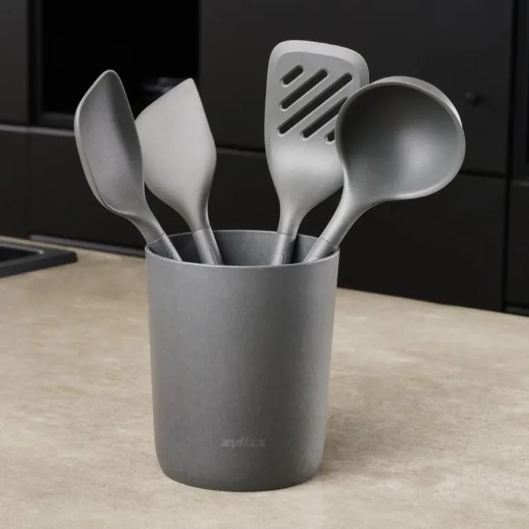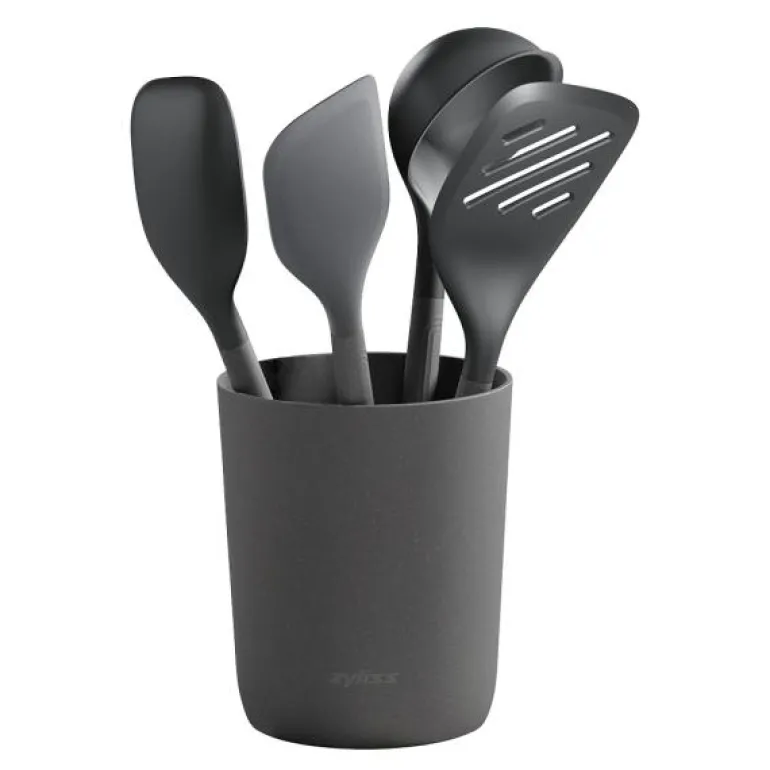 Praktisk 5-delers redskapssett fra Zyliss. Dette redskapssettet inneholder en beholder, og de 4 viktigste redskapene for daglig bruk en stor øse, kjøkkenskje, og to stekespader. Redskapene oppbevares i den generøst utformet oppbevaringsbeholderen med en avtakbar skillevegg der hvert redskap har sin plass. Oppbevaringsbeholderen og redskapene kan rengjøres enkelt og uanstrengt. Hele settet har et elegant utseende og vil se bra ut på ethvert kjøkken.