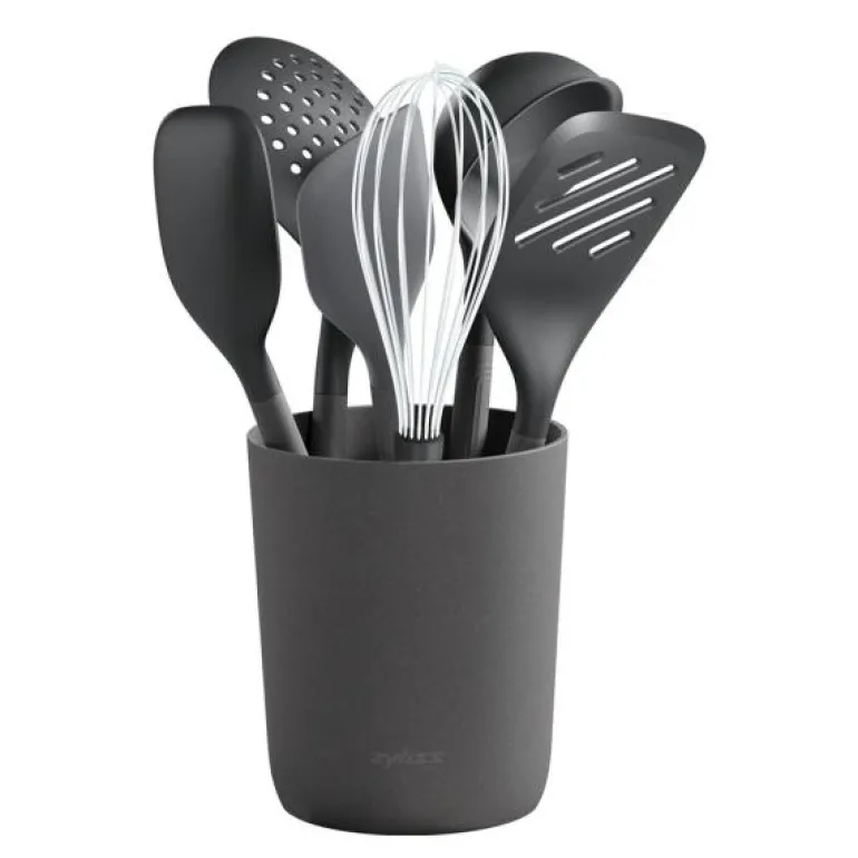Praktisk redskapssett i 7 deler fra Zyliss. Dette redskapssettet inneholder en beholder, og de 6 viktigste redskapene for daglig bruk; en stor øse, to stekespader, kjøkkenskje, ballongvisp, skimmer. Redskapene oppbevares i den generøst utformet oppbevaringsbeholderen med en avtakbar skillevegg der hvert redskap har sin plass. Oppbevaringsbeholderen og redskapene kan rengjøres enkelt og uanstrengt. Hele settet har et elegant utseende og vil se bra ut på ethvert kjøkken.