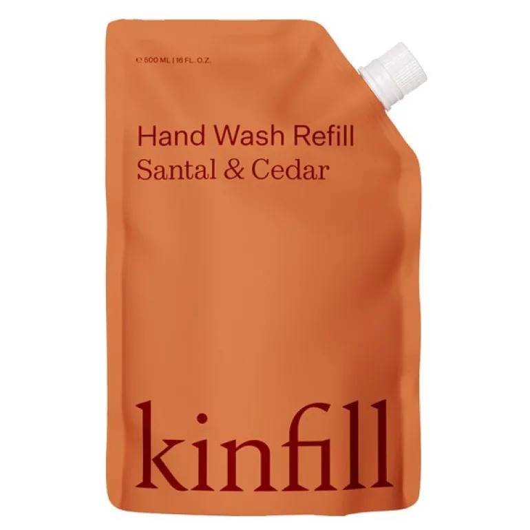 Refill håndvask 500 ml santal & cedar fra Kinfill. En etterfyllbar håndvask med plantebaserte ekstrakter av chia, ginseng og sheasmør (karité). Denne formelen hydrerer, beskytter og nærer huden din. Fri for mineraloljer og silikoner.