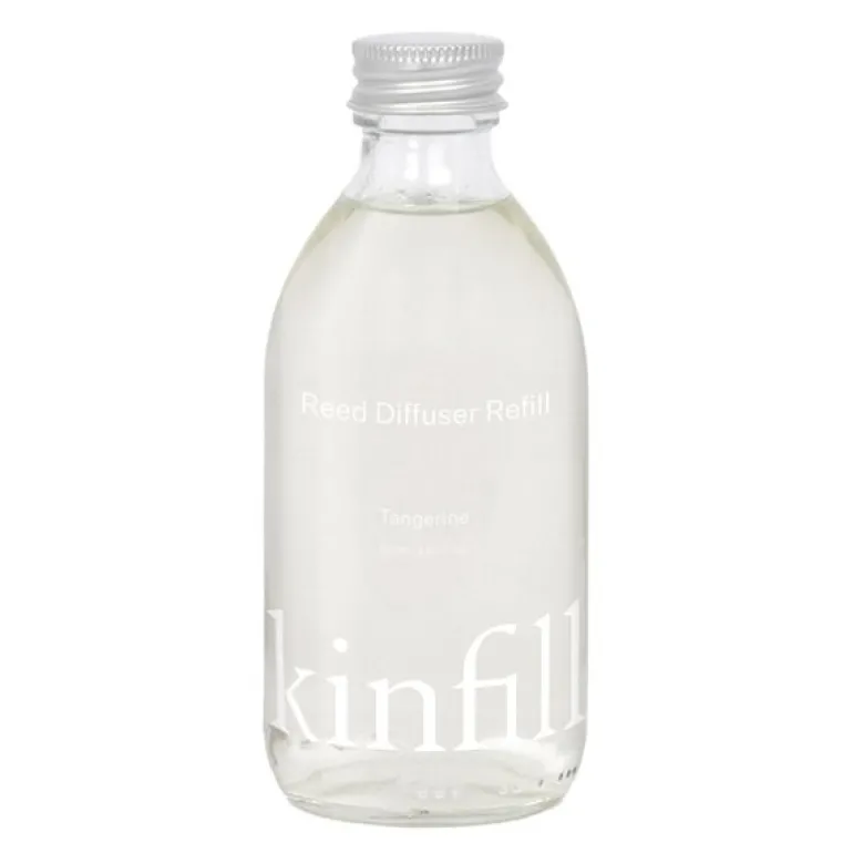 Refill Reed diffuser 250 ml tangerine fra Kinfill. Refill-refillen Kinfills er laget for å fylle opp diffusoren din med letthet, og omslutte rommet ditt i en kontinuerlig bølge av raffinerte dufter. Duft med noter av neroli, bergamott, appelsinblomst, ylang-ylang og floral musk.
