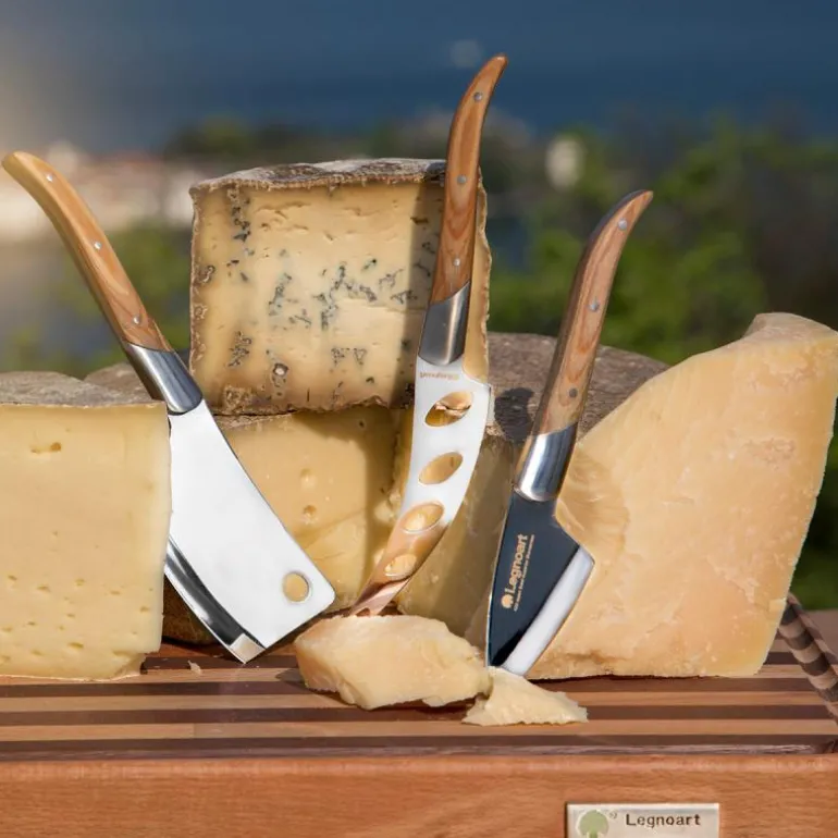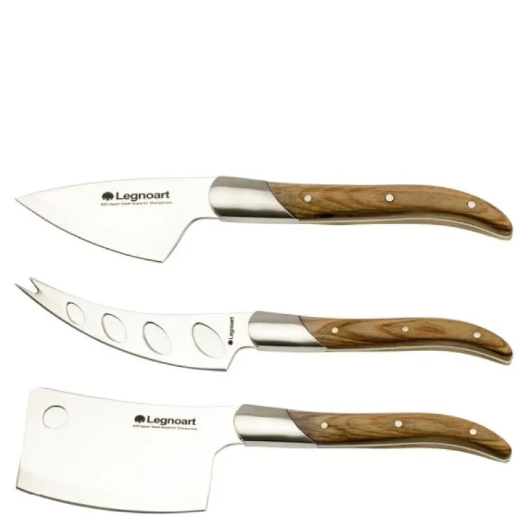 Osteknivene er både pene og har ergonomisk utformede håndtak i tre, noe som gjør dem behagelige å bruke da de ligger godt i hånden. Knivene er laget av høykvalitets stål, det er 3 kniver i settet, du kan derfor skjære kremete, harde og myke oster, det er et gaffelhode i enden av den ene kniven slik at du kan flytte på de kuttede skivene uten å få ost på fingrene dine. Settet leveres i en eksklusiv gaveeske. For å opprettholde den gode kvaliteten anbefales det å vaske knivene for hånd.